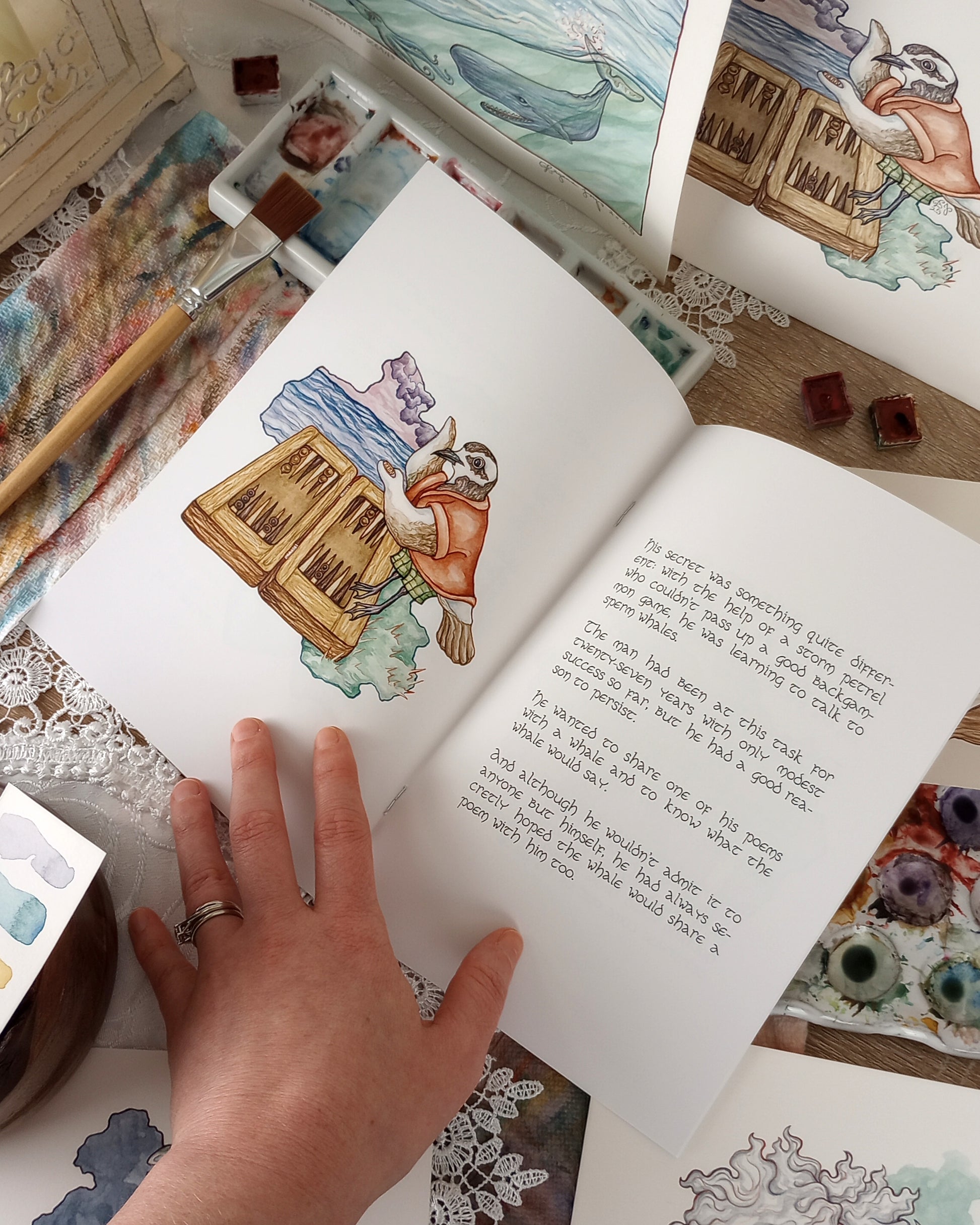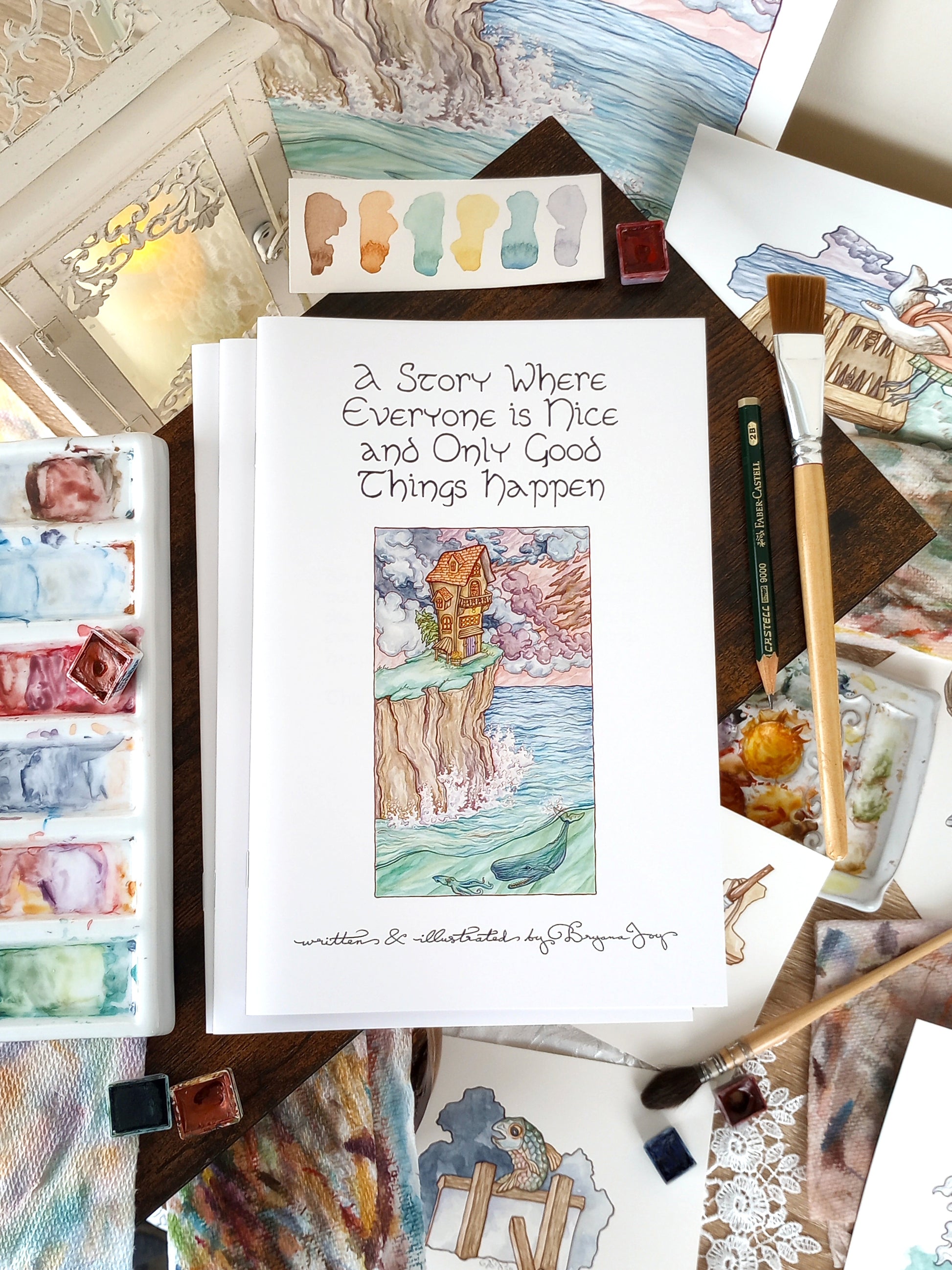 This listing is for a 20-page illustrated short story zine featuring my original oceanic fairytale "A Story Where Everyone is Nice and Only Good Things Happen" (782 words). It's typeset in a font created from my handwriting and accompanied by seven vignette watercolor illustrations created just for this story. (Some of the original illustrations are shown in the listing photos as props, but the original paintings are not included with this listing, only the printed zine.) The zine measures 6x9 inches and is professionally-printed. It ships to you directly from my small home studio in Southeastern Pennsylvania.