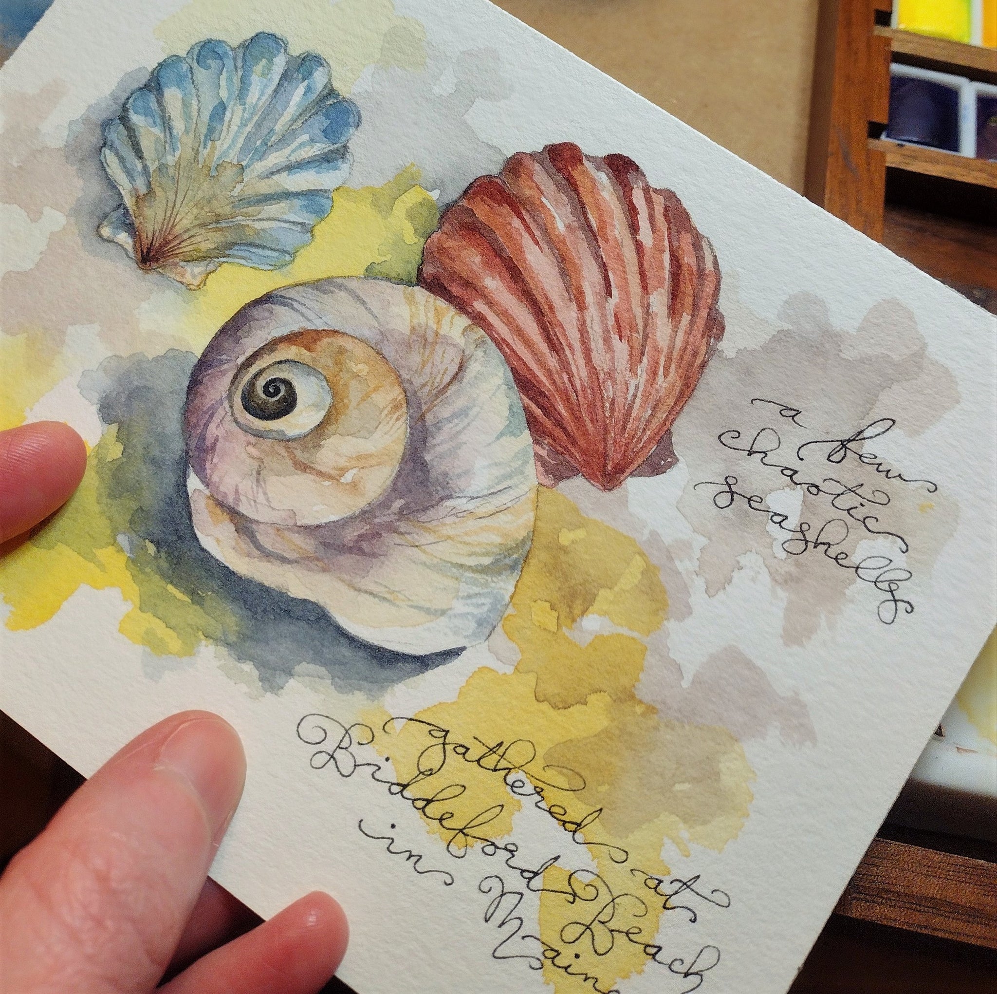 Seashell sketch ($25), Eastern Egg Rock Sketch ($25), Prufrock Pendant ($30), Sea Fever Pendant ($40)