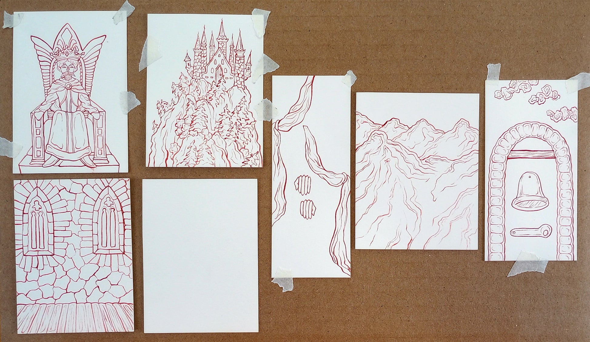 To illustrate "when tyrants tremble in their fear," the king's hand are strung through the box with thick copper wire and can be jiggled using wooden knobs on the back of the box to suggest trembling. To illustrate "and hear their death knell ringing," the bell is composed of two parts joined to the beam with a brass split pin. A thread tied through a hole in the ringer can be pulled back and forth to "swing" the bell on its perch overlooking the grim castle.