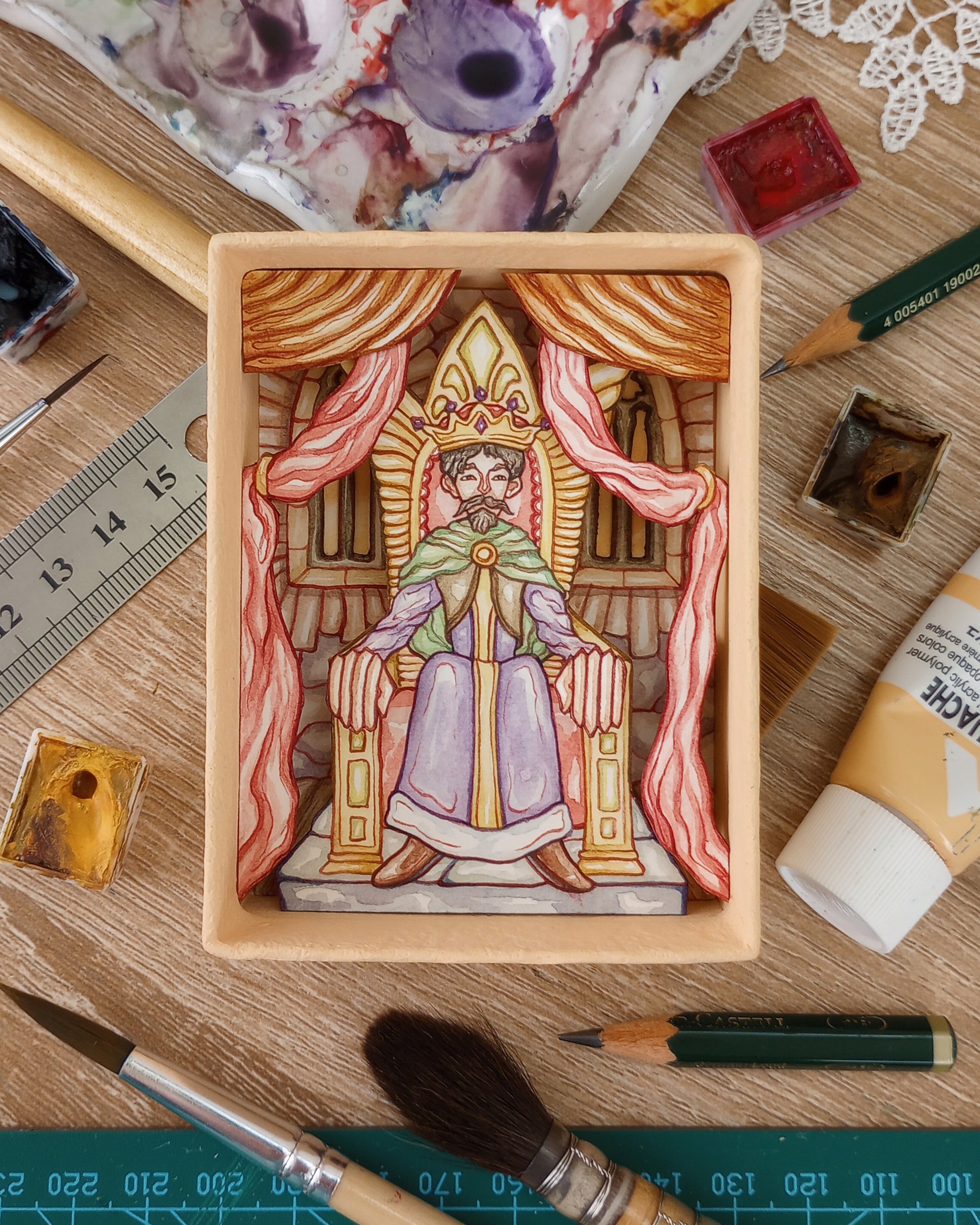 With the lid closed, the box measures roughly 3.75 x 2.75 x 1.25 inches. This is not a print, but a one-of-a-kind original painted papercraft creation.