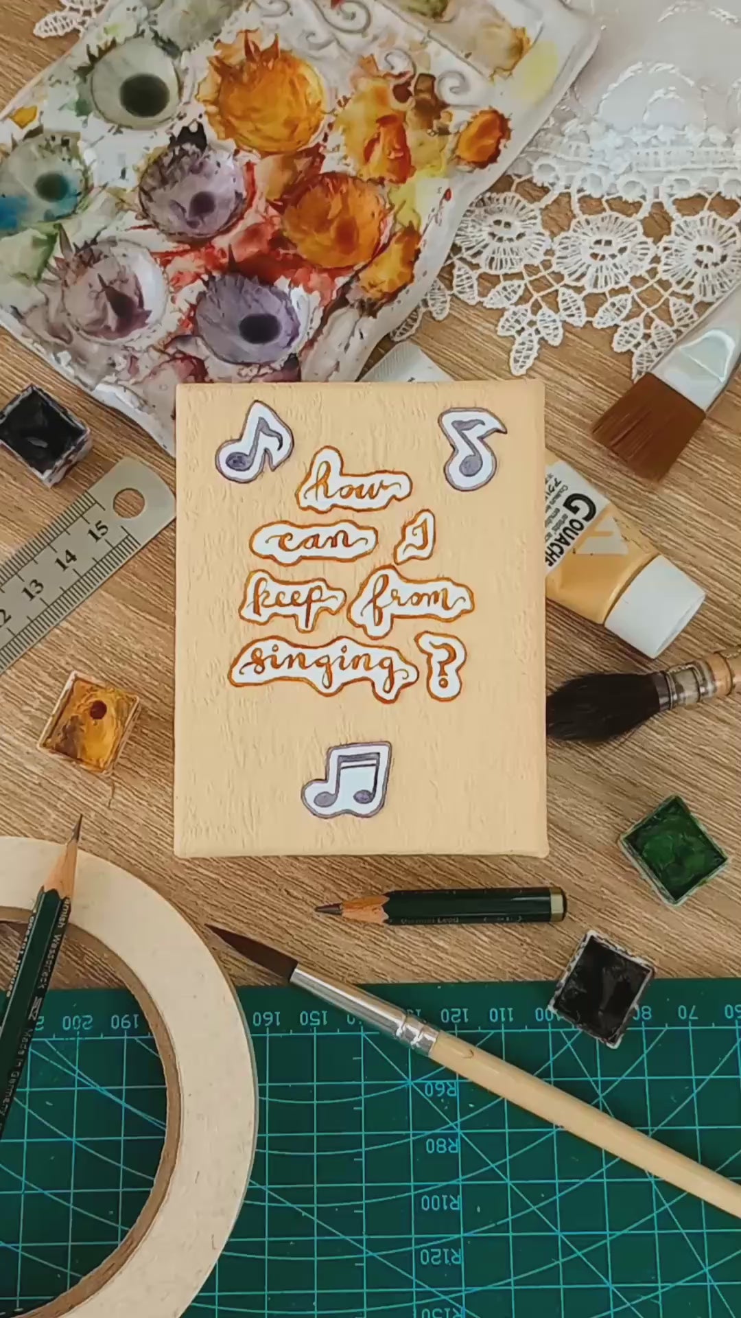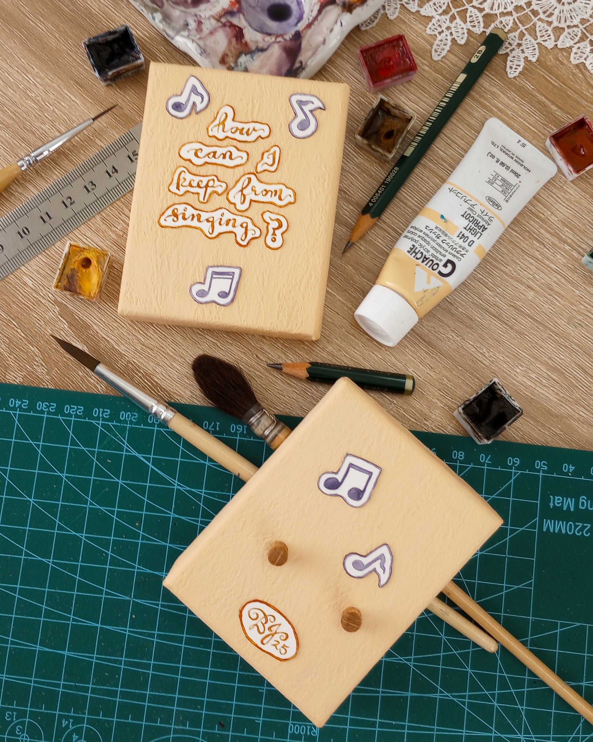 This listing is for an original miniature diorama box scene painted with professional-grade watercolors on 100% cotton Arches watercolor paper and assembled using archival-quality glue. The diorama box is made of chipboard, covered with textured paper, and then painted a light apricot using velvety acryla gouache paint. The box illustrates lines from a 20th-century version of the old hymn "How Can I Keep From Singing?" and features moving parts to go with the song.