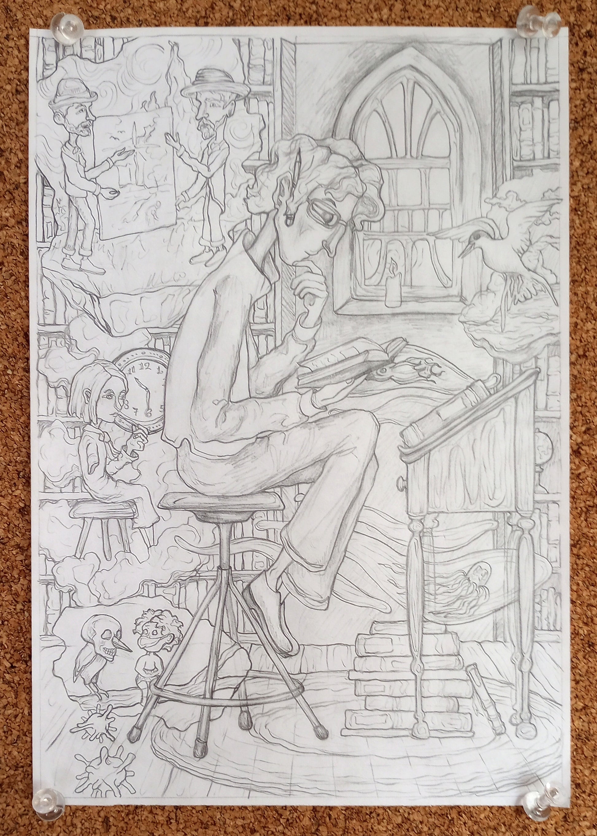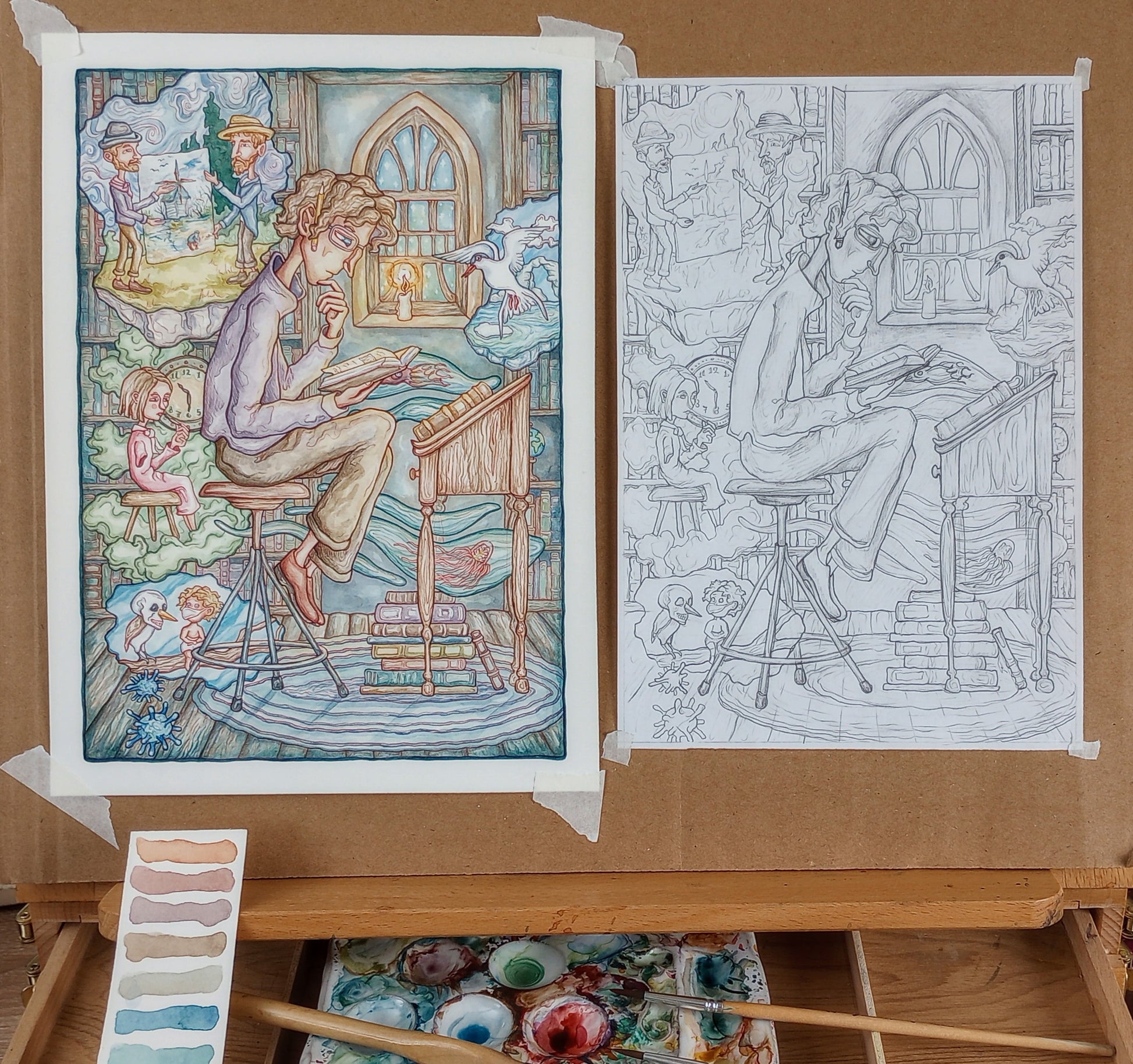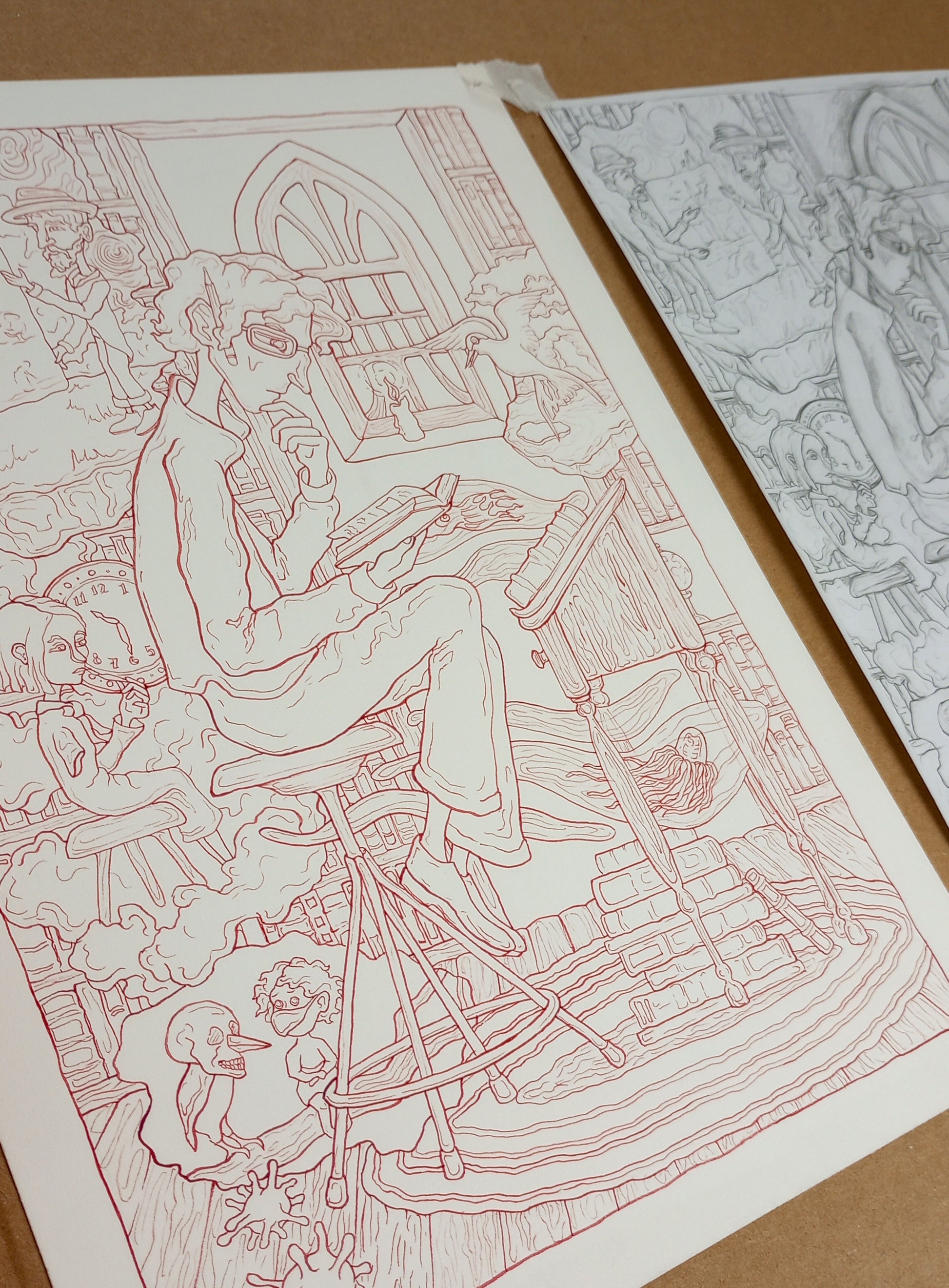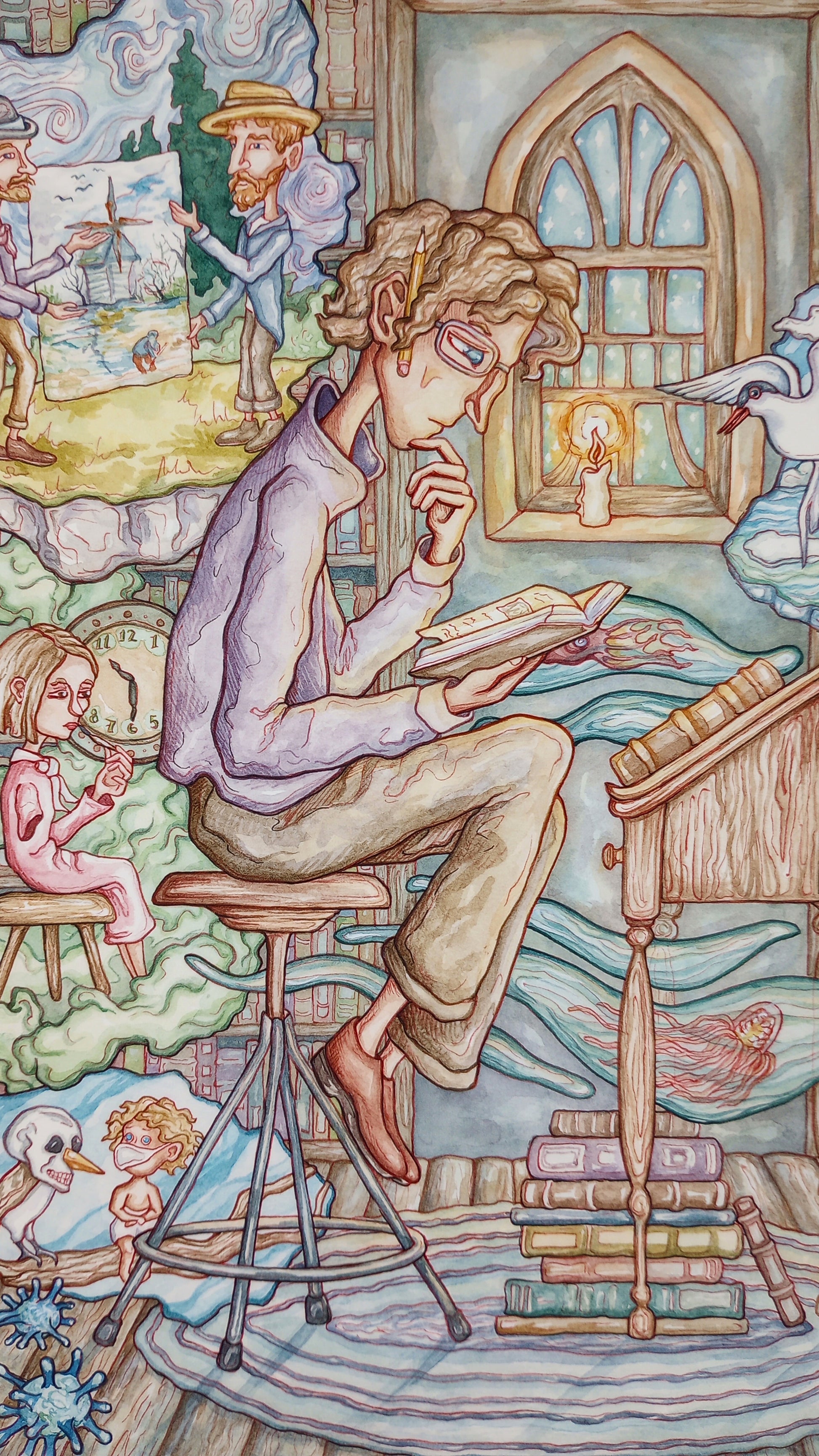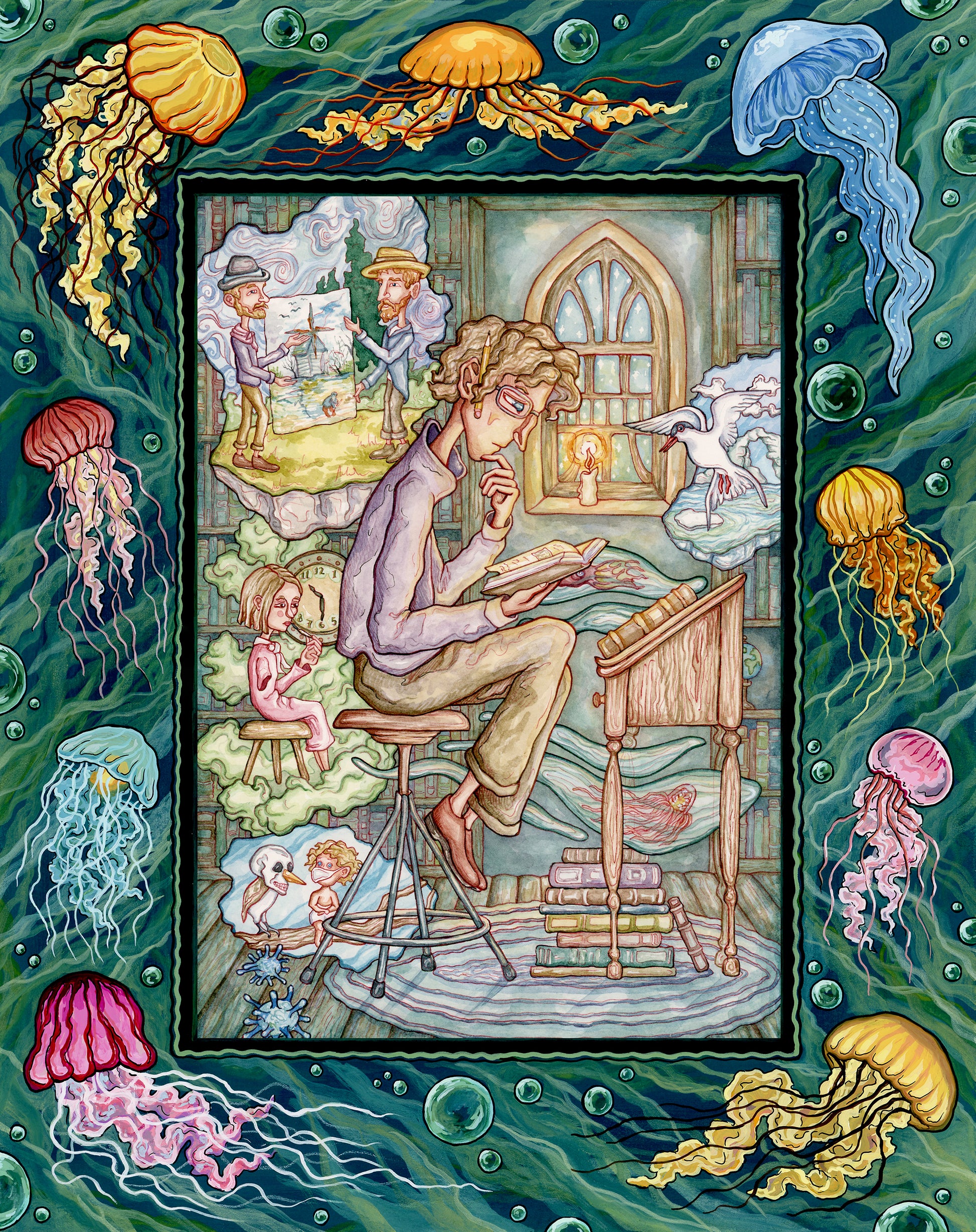 In this painting, I wanted to illustrate the humble and hungry pursuit of knowledge. My protagonist sits in a dimly-lit library well-stocked with books while scenes from his reading float about the room. These scenes are populated with figures from five of the most impactful non-fiction books I’ve read in the past two years. The jellyfish mat—painted with gouache and black ink—represents untraveled depths, the places we’ve not been yet, the questions we perhaps haven’t even known to ask.