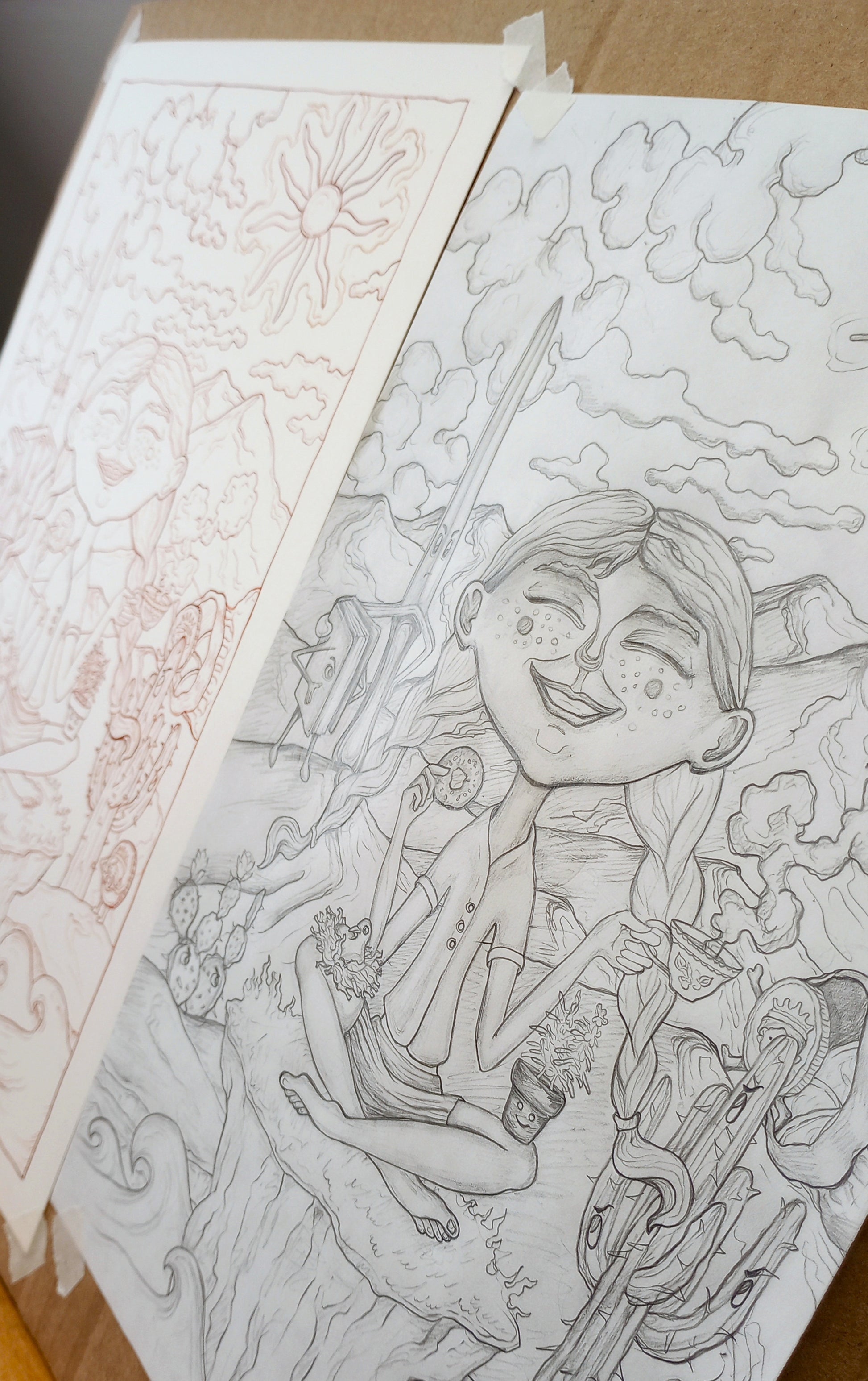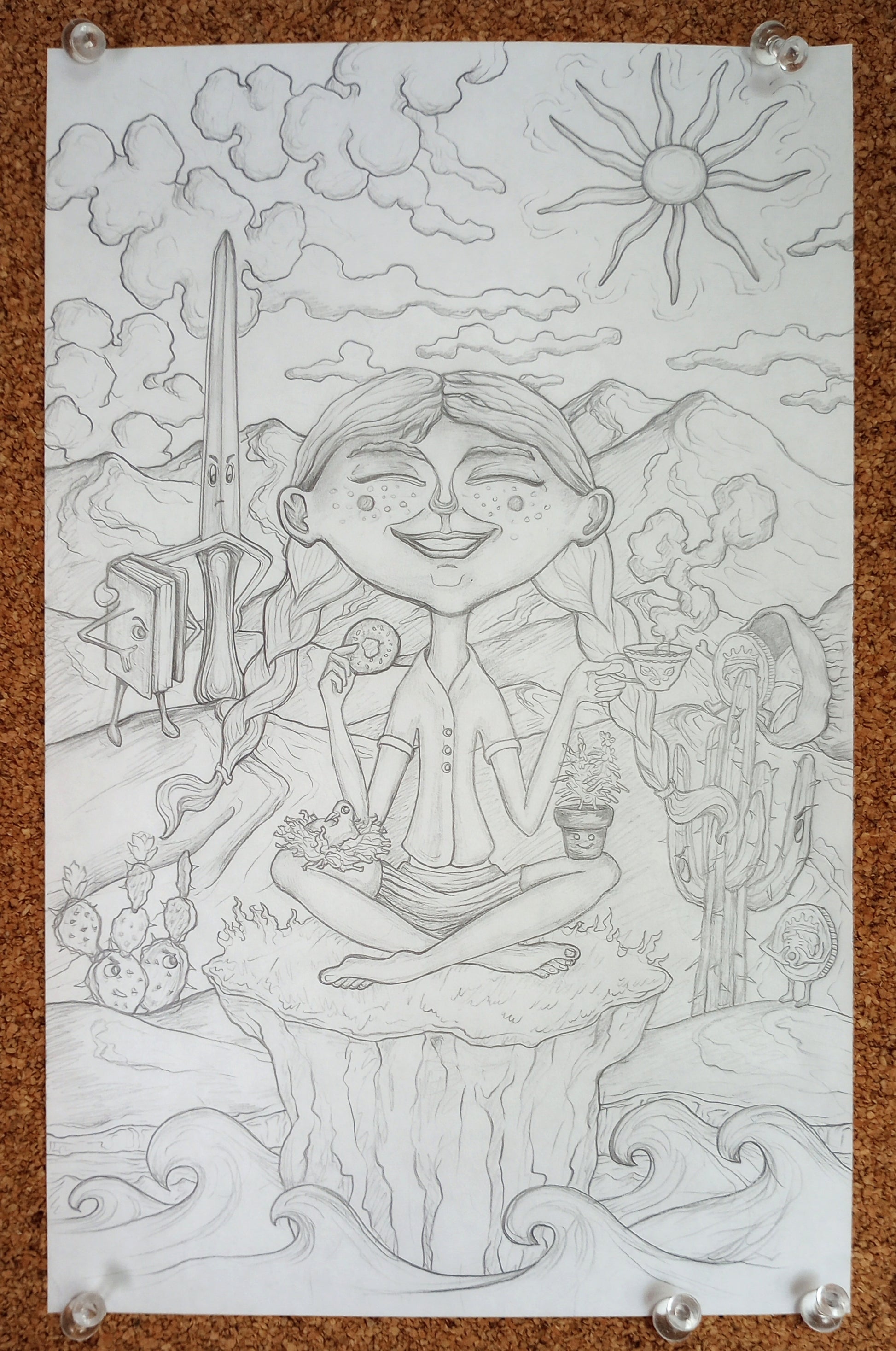 In this painting, my protagonist sits with her face turned cheerfully but resolutely away from the barren desert and disapproving representatives of an old paradigm. She is facing the ocean and making herself a home for peace, the darling bird. She holds on her knee a pot of rosemary—for remembrance, if you remember your Hamlet. (“they ask me to remember/but they want me to remember/their memories/and i keep on remembering/mine,” wrote Lucille Clifton in her poem “why some people be mad at me sometimes.” And well.)