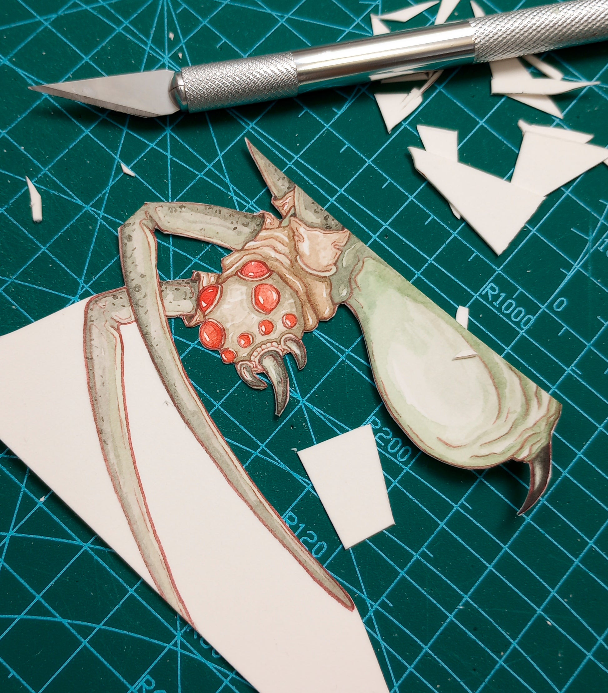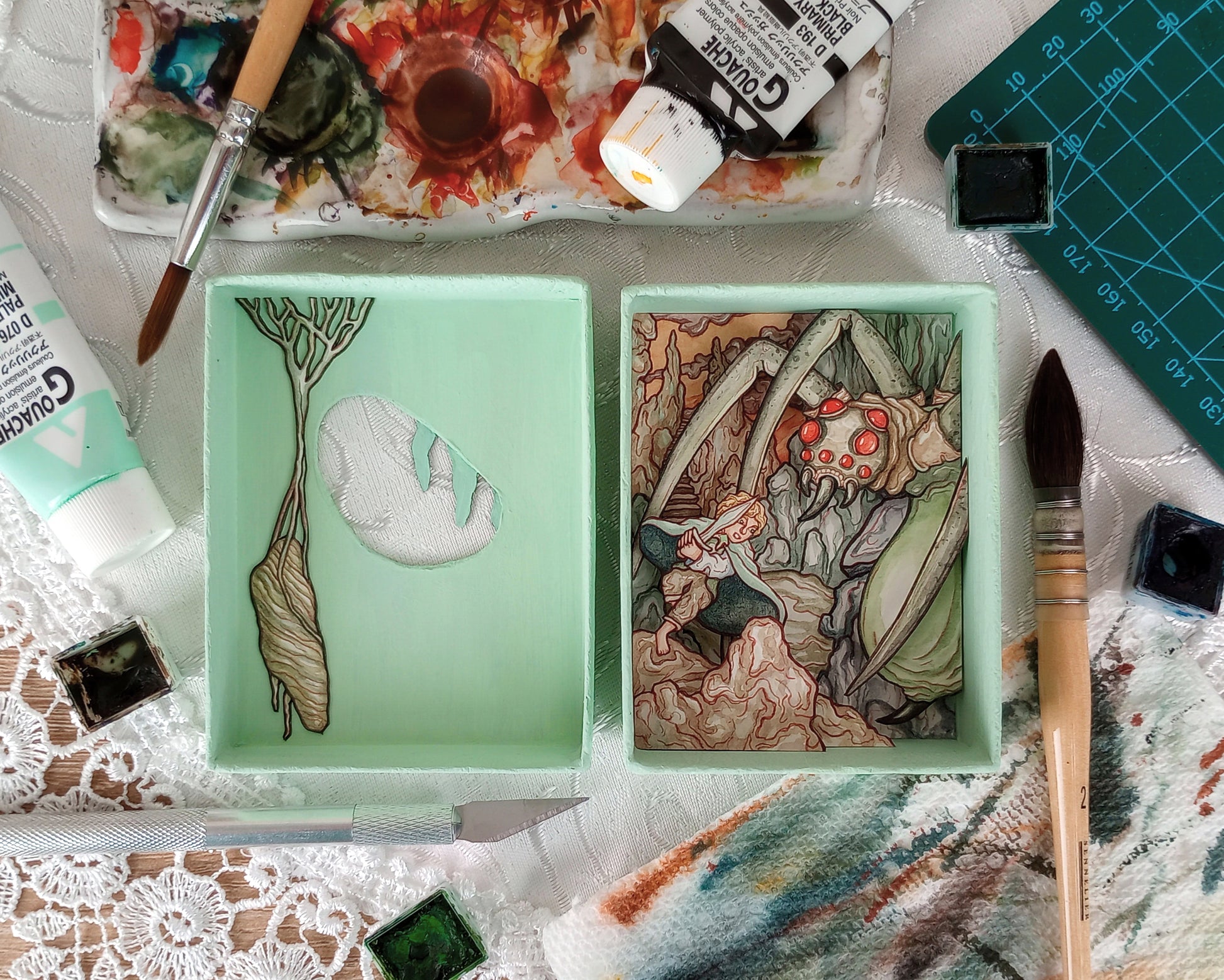 This listing is for an original miniature diorama box scene painted with professional-grade watercolors on 100% cotton Arches watercolor paper and assembled using archival-quality glue. The diorama box is made of carboard, covered with textured paper, and then painted an eerie Morgul green using velvety acryla gouache paint. With the lid closed, the box measures roughly 3.75 x 2.75 x 1.25 inches. This is not a print, but a one-of-a-kind original painted papercraft creation.
