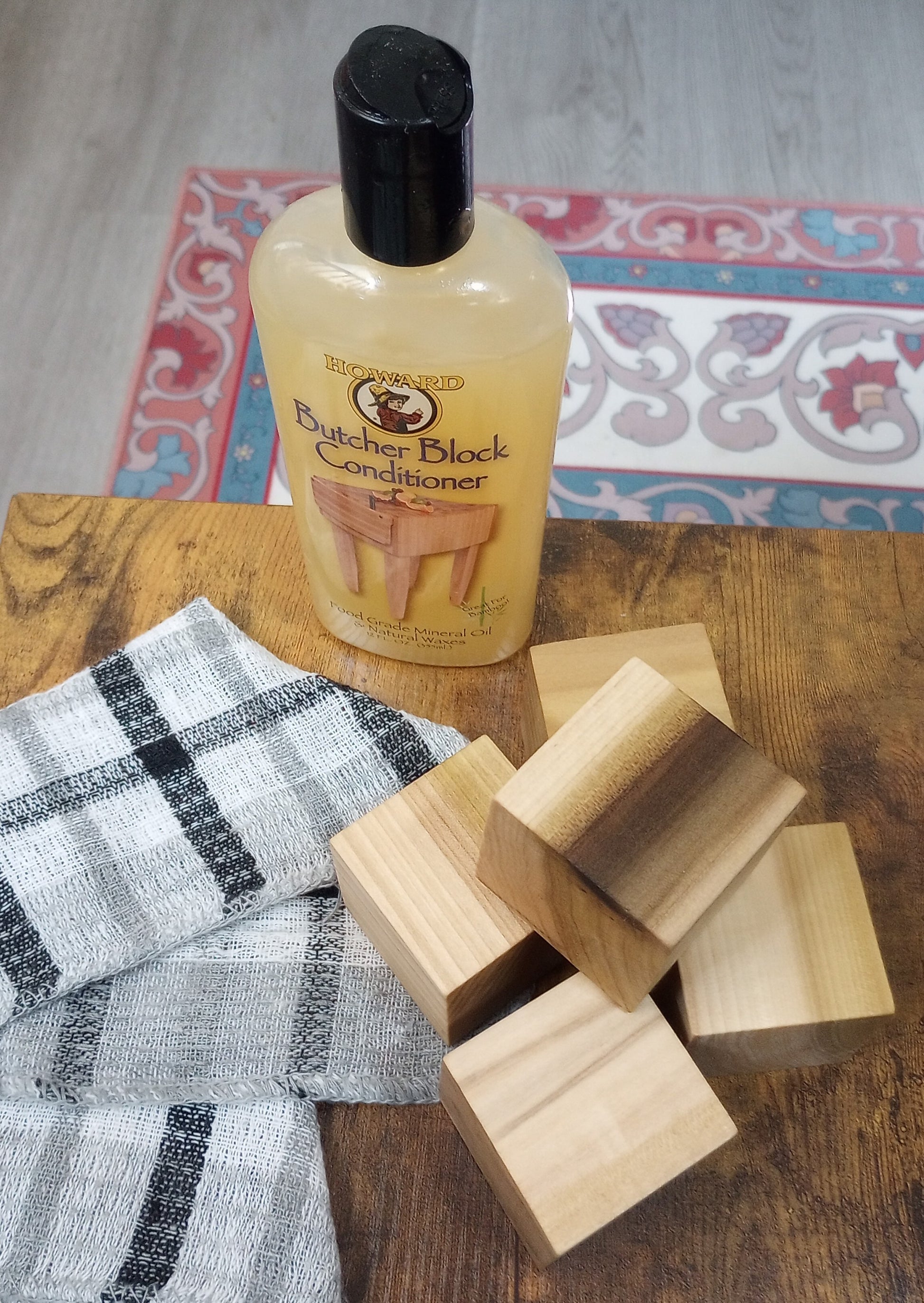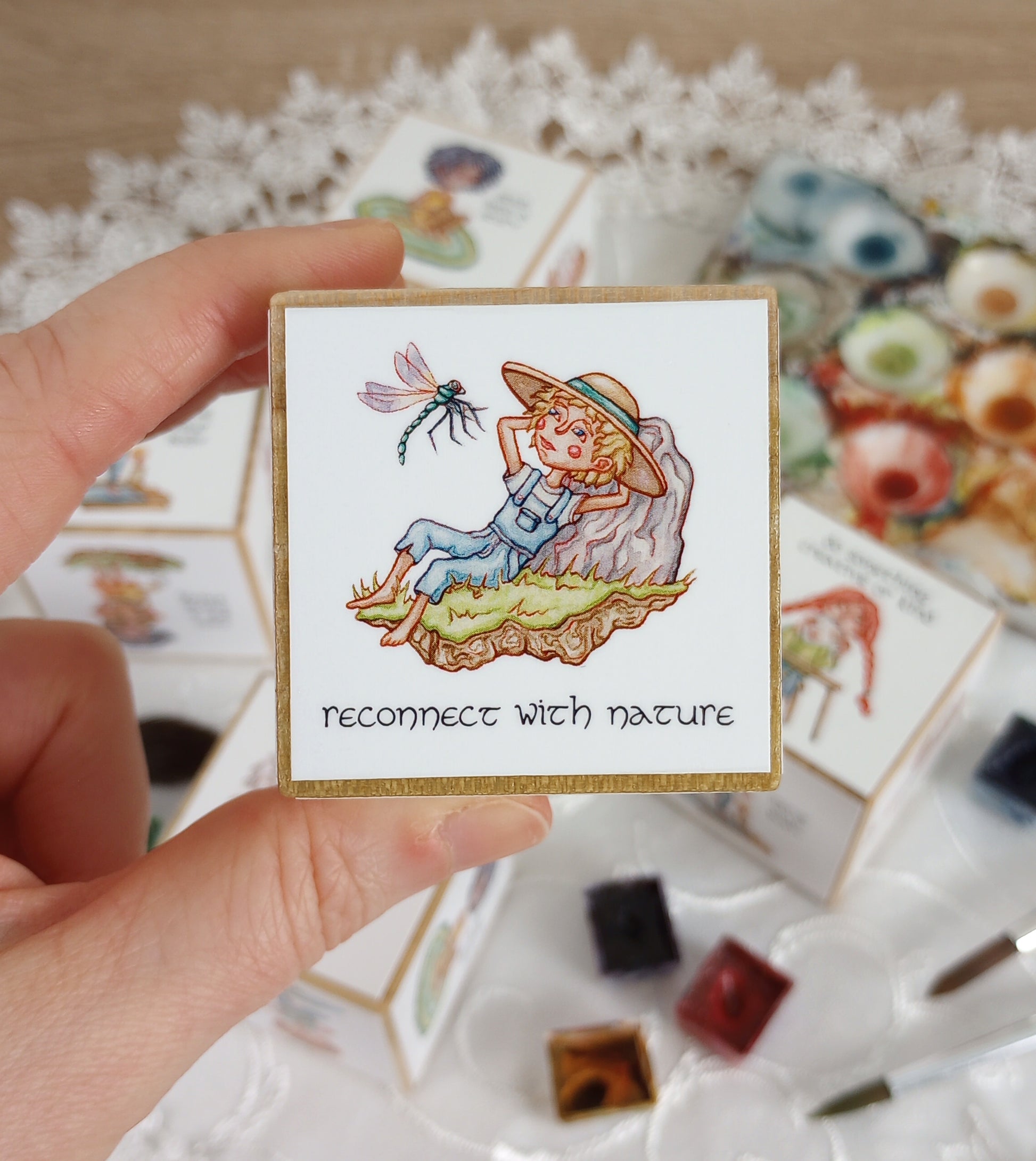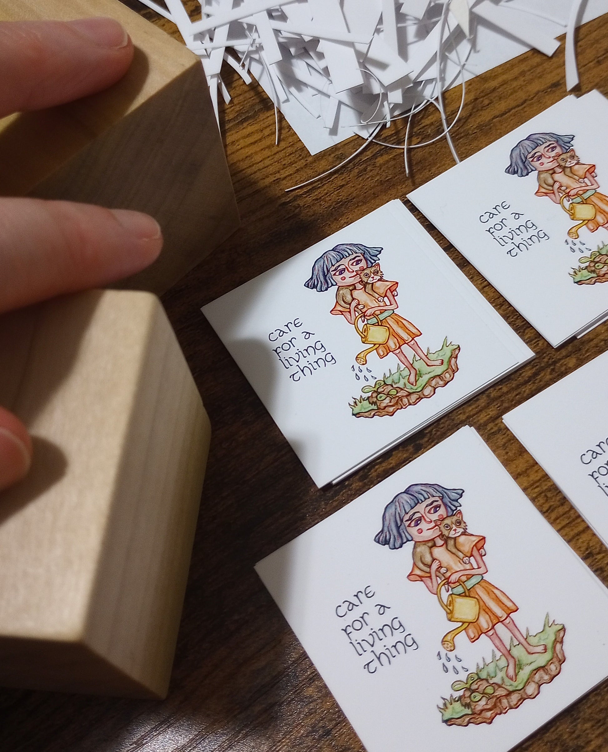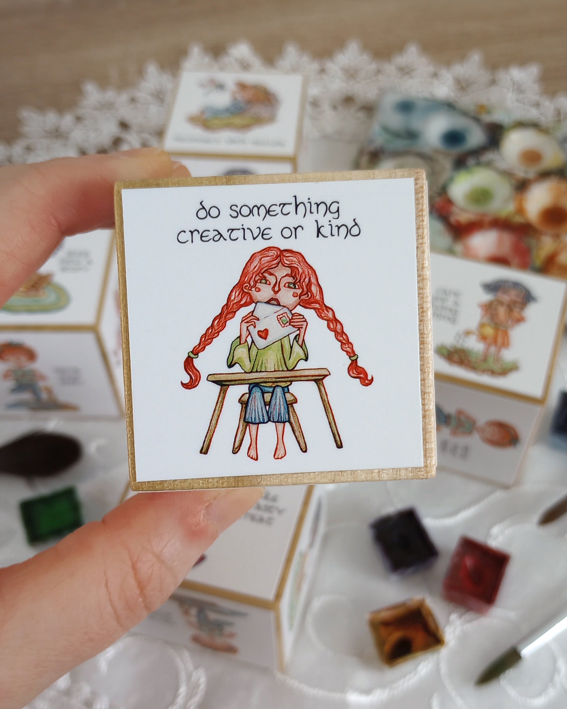 To create these dice, I first sand, condition, buff, and seal each wooden cube by hand using sandpaper, a food-grade butcher's block conditioner, a buffing cloth, and then a decoupage medium. I then cut out miniature printed versions of the six self-care characters and affix them to the cube using decoupage medium.