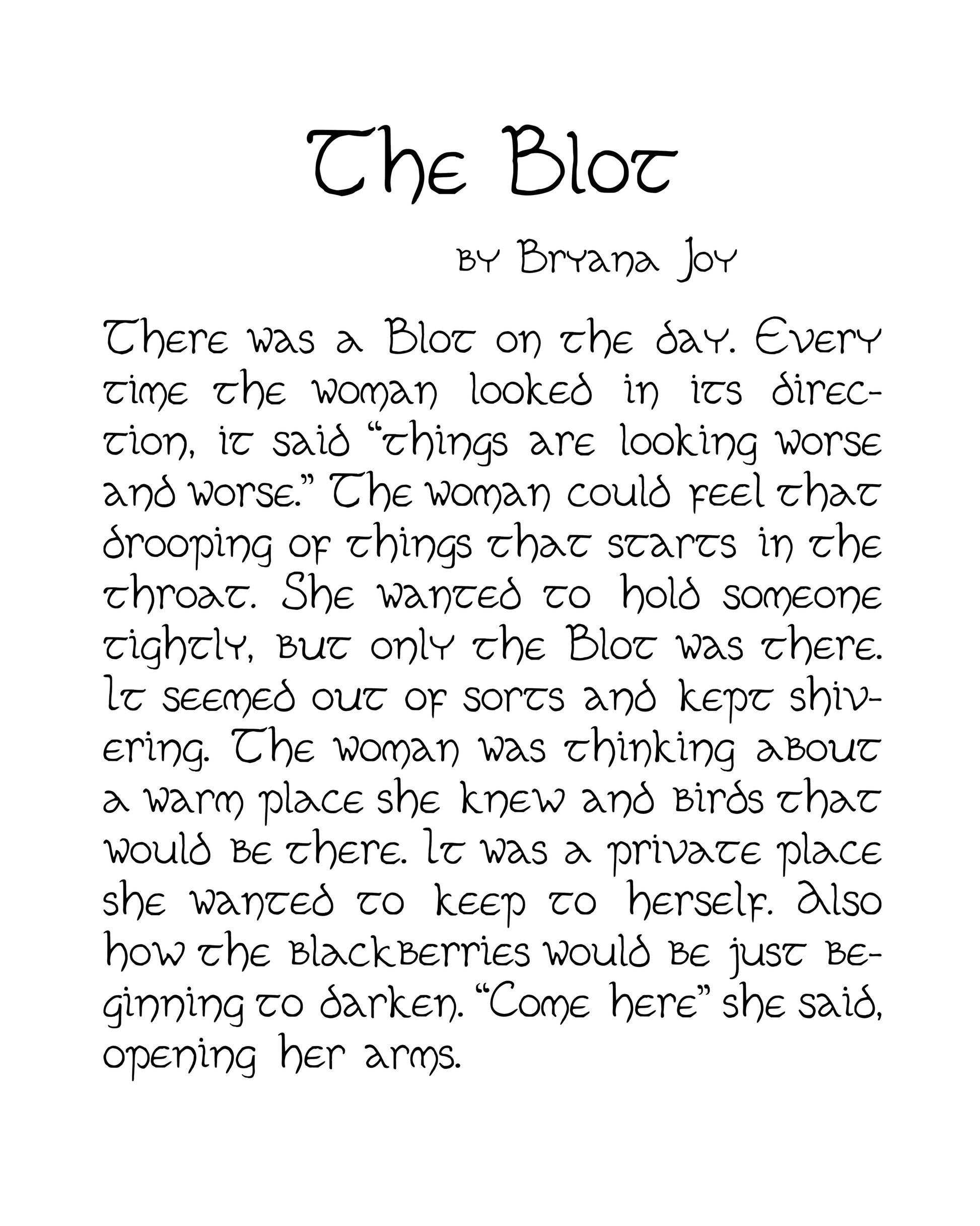 There was a Blot on the day. Every time the woman looked in its direction, it said “things are looking worse and worse.” The woman could feel that drooping of things that starts in the throat. She wanted to hold someone tightly, but only the Blot was there. It seemed out of sorts and kept shivering. The woman was thinking about a warm place she knew and birds that would be there. It was a private place she wanted to keep to herself. Also how the blackberries would be just beginning to darken. “Come here” she said, opening her arms.