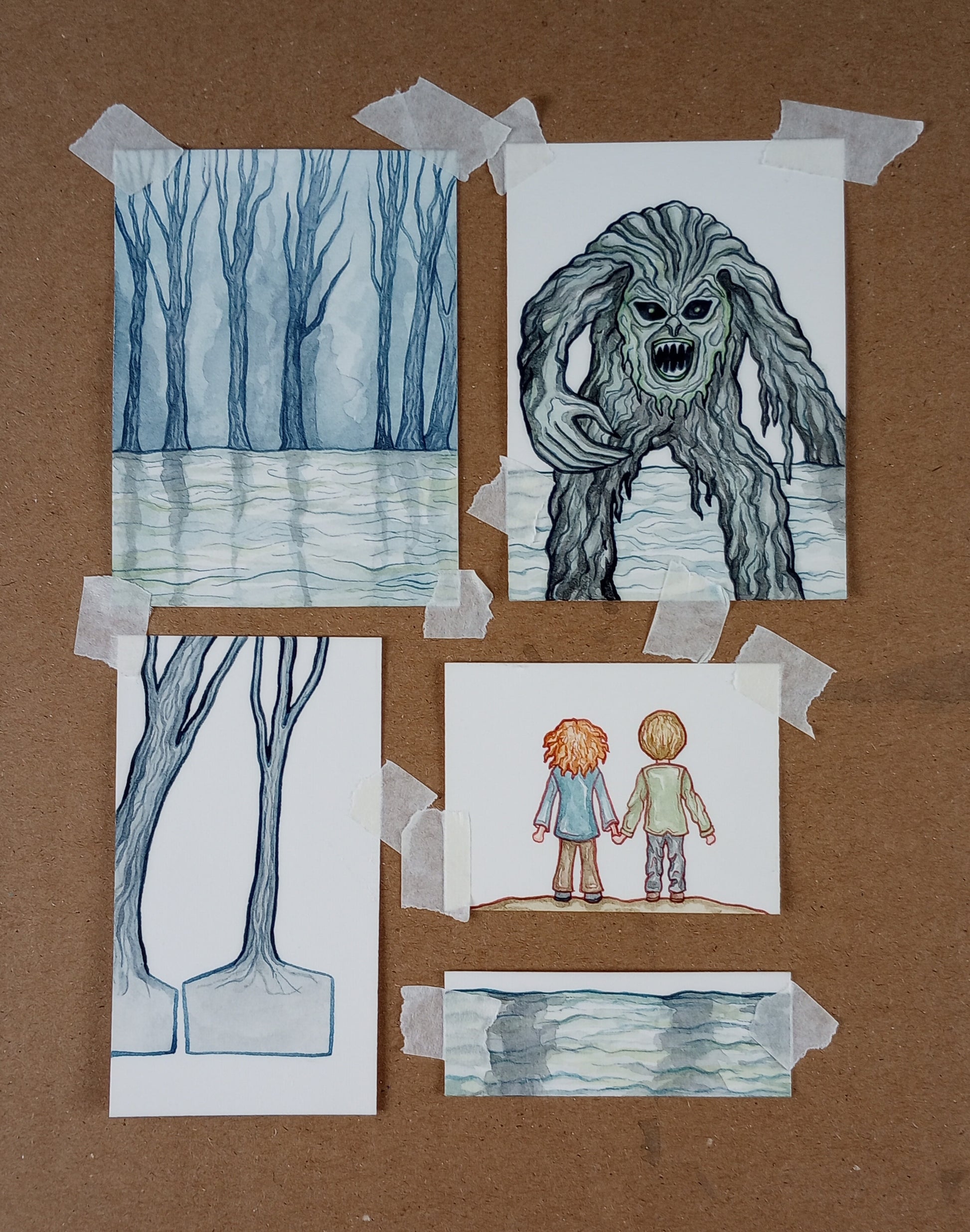 I had this idea swirling about up in my head: two children holding hands and staring at a frightening bog monster emerging from the mist. We cannot know what will happen to them, because the scene is only a split-second long, trapped forever in the indefinite lifespan of art. We can know only that they looked straight ahead at some point into the face of what was coming for them, took care of each other, and were brave.